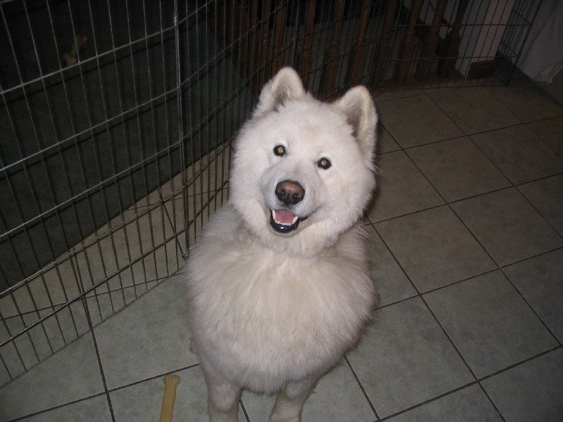 Mishka came to us from another rescue group in Alberta after his owners contacted them to surrender him late November, 2007. They had initially bought Mishka as a cute fluffy puppy for their children as a Christmas present. Of course once he was a few months old, he was too big and too energetic for the house, so they kenneled him outside and basically forgot about him. Once the barking and digging got too much, and he became too uncontrollable after no attention or training, they decided to surrender him. They asked their vet if there was a Samoyed Rescue group in the area, and we were contacted by the vet clinic.